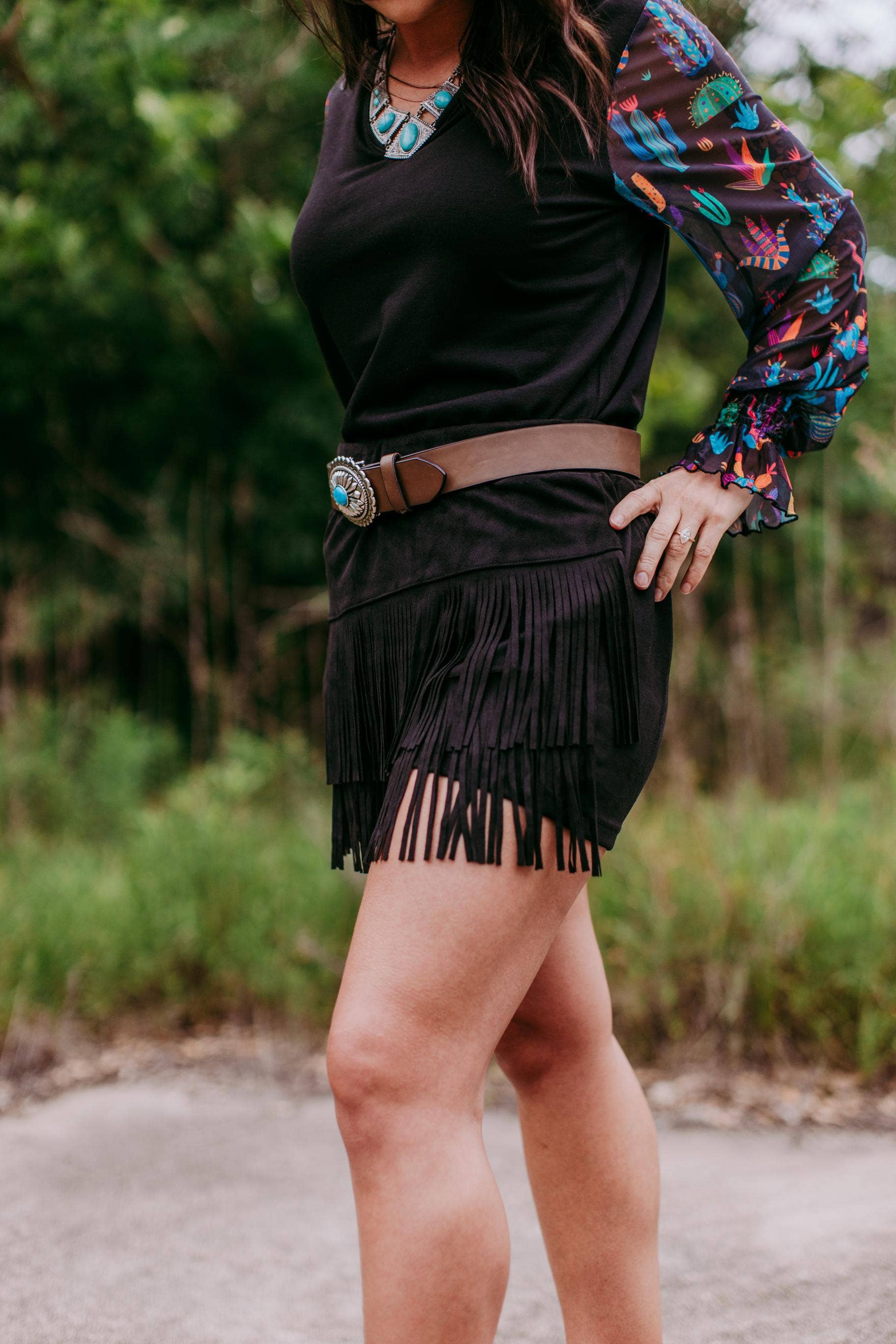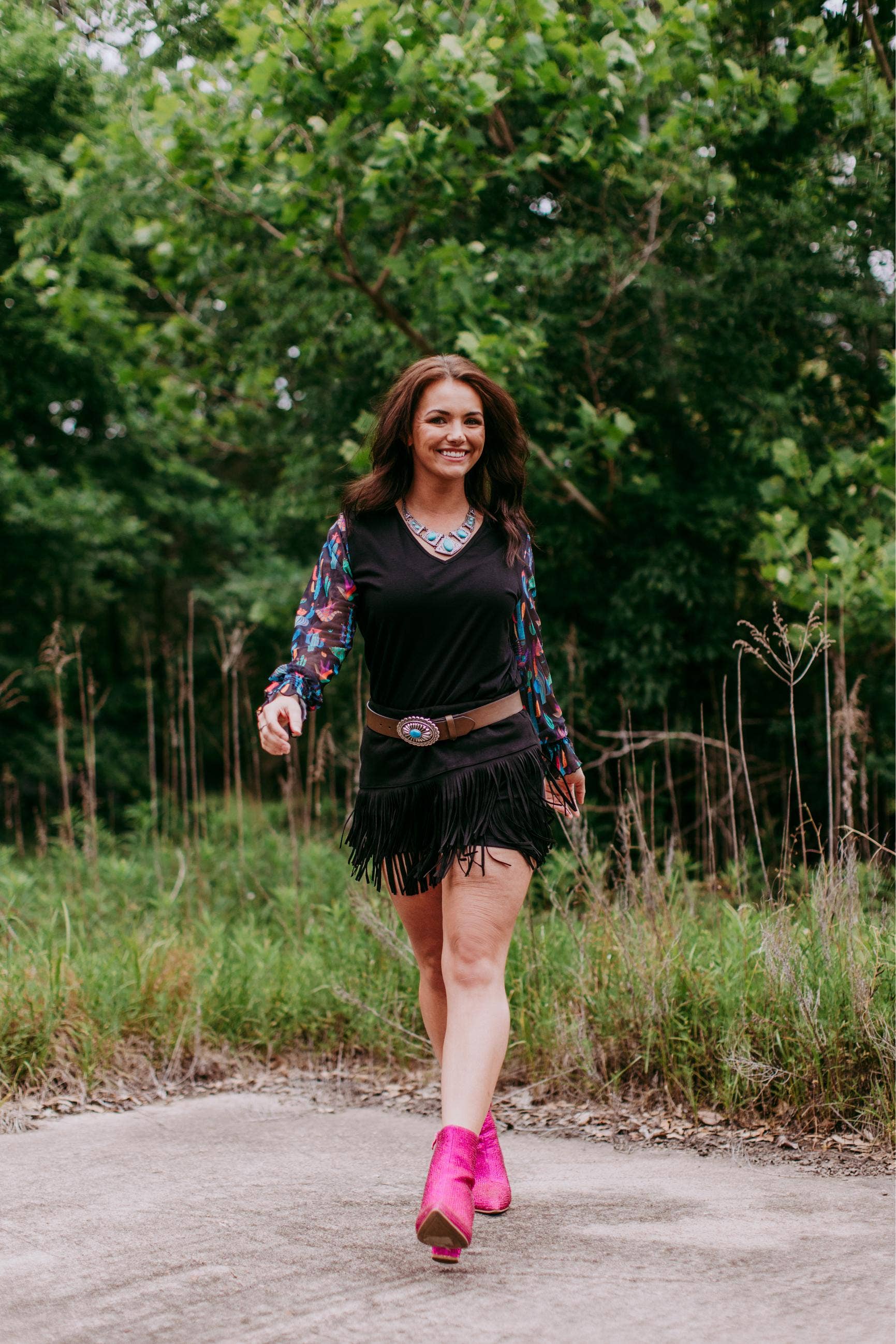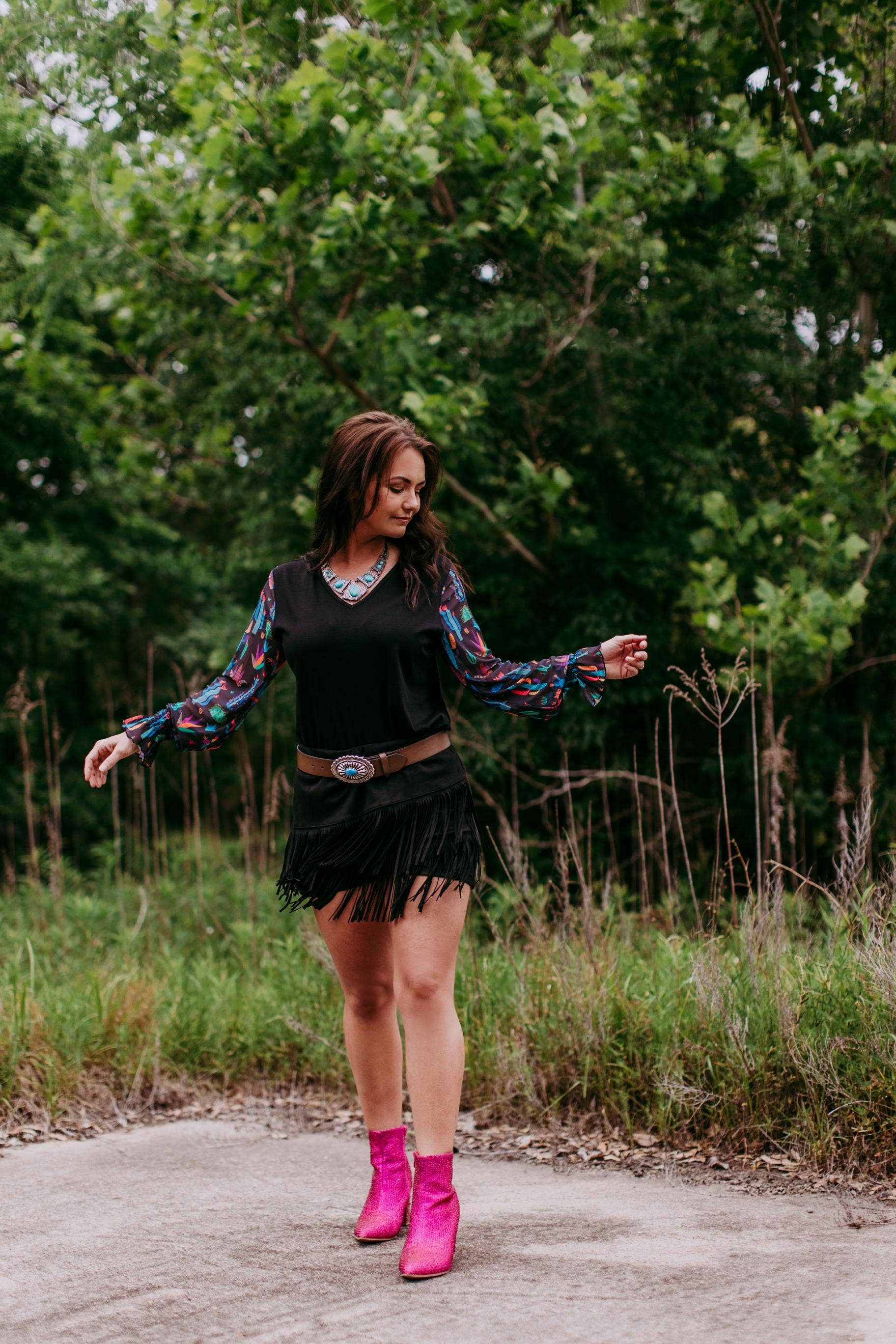 Simple in the front, statement in the sleeves. This black v-neck long sleeve is anything but basic. The sheer mesh sleeves bring the drama with bold desert-inspired patterns in vibrant turquoise, pink and orange hues. Lightweight and breathable, it's easy to dress up with jewelry or keep casual with jeans and boots. A perfect piece when you want just the right mix of classic and eye catching.