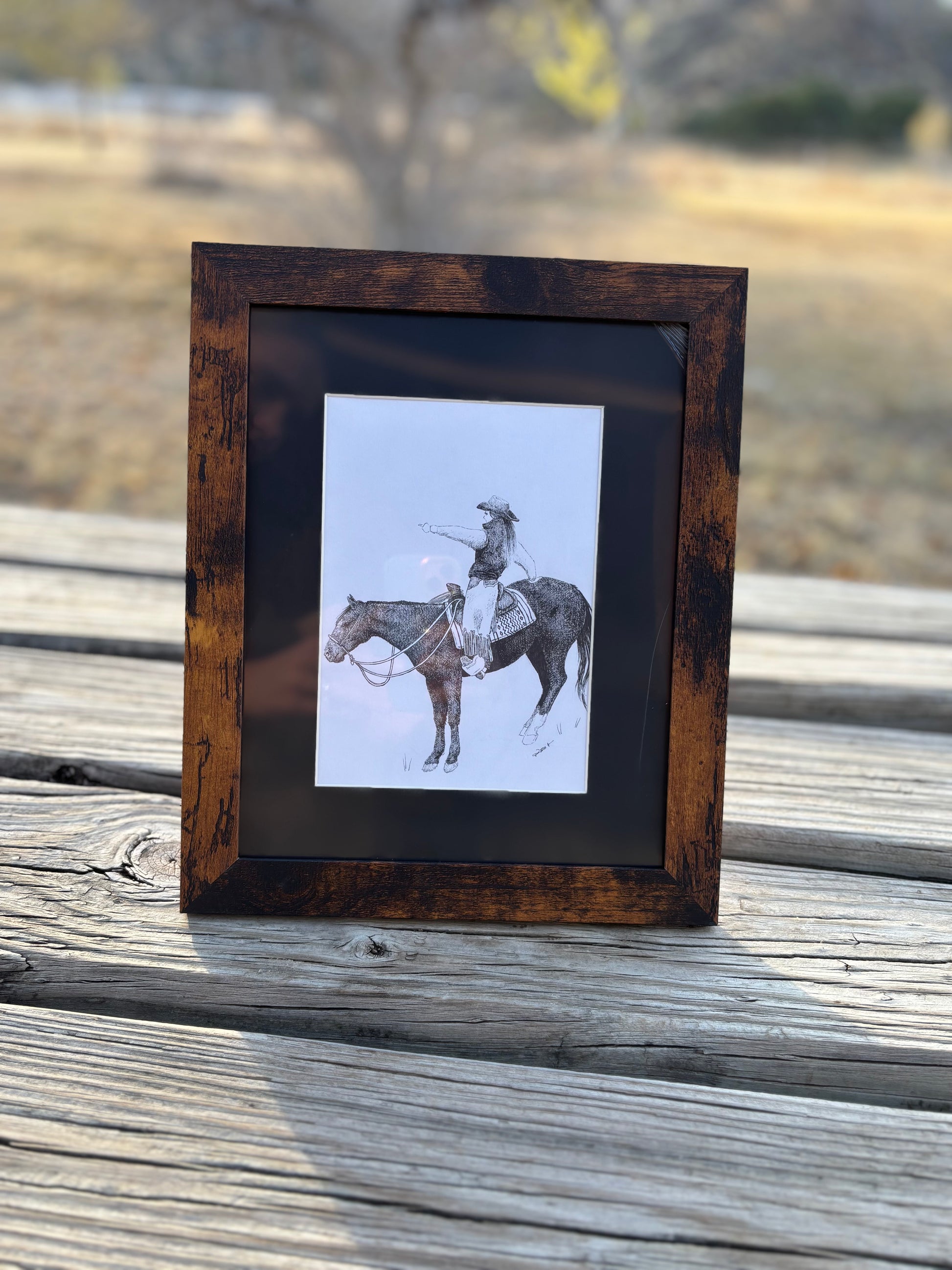 Framed drawing of a cowgirl looking out yonder.